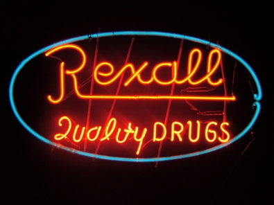 Nice, 2-color neon on a glass frame for Rexall Drugs. Circa the 1940s. Small repair to the word Quality. Measures 25 by 13.