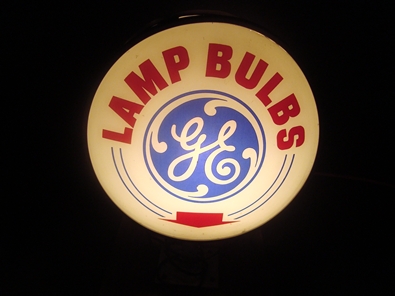 Excellent condition on this 2-sided, convex reverse glass sign for GE Lamp bulbs. The lighted portion measures about 12 1/2 by 12 1/2 while the mounting pole adds an additional 4 inches.