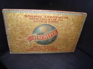 Our 2nd fairly incredible Schlitz item is this train board. This was actually a fold down table top that would have been in the dining car in the train - the wording was such that people on both sides saw the same writing facing them. Unfortunately, the view of the logo only worked from one side. Moderate overall wear - these were used (and often abused) but this one has mostly stood the test of time. Measures 25 by 17.