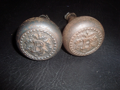 Nice, but used, condition on these early pair of heavy-metal door knobs dating back to the days of Phillip Best.