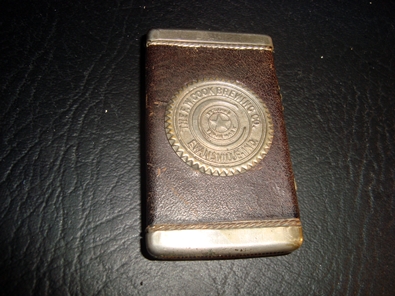 Nice, solid condition on this leather-wrapped logo matchsafe from Cooks out of Evansville, Indiana. Reverse side has Cook in script and, on one side, the word Evansville.