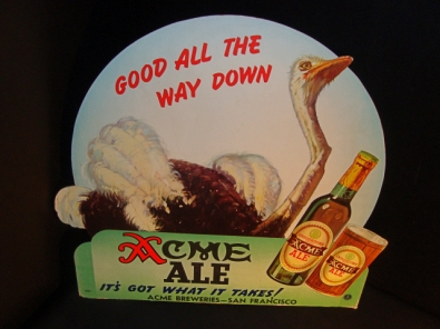Rare cardboard sign out of California for Acme Brewing - note the throat area - quite the hoot! Measures about 24 tall by 26 wide at the longest points. Minor wear - mostly to the edges with a little lifting at the exposed tail and can at the left and right most points.