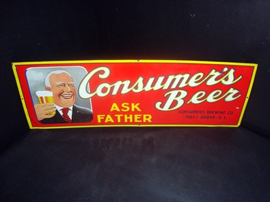 Excellent condition - just a few minor wear points on this 28 by 9 1/2 inch tin sign from Consumers out of Newark, Ohio. Manufactured by Scioto Sign.