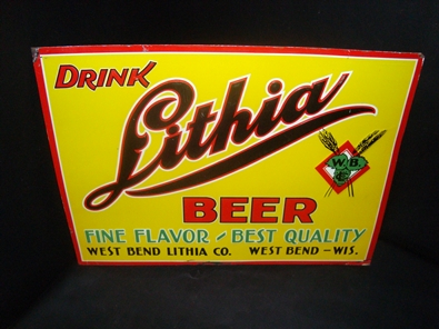 A solid example of this embossed tin sign out of West Bend, Wisconsin. Mostly just some edge wear on this 24 by 18 piece.
