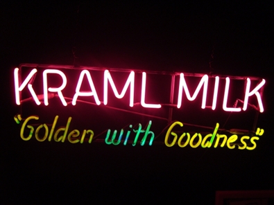 All original condition on this 36 by 11 neon sign for Kraml Milk from the Kraml Dairy of Chicago. On a glass frame with a detached transformer.